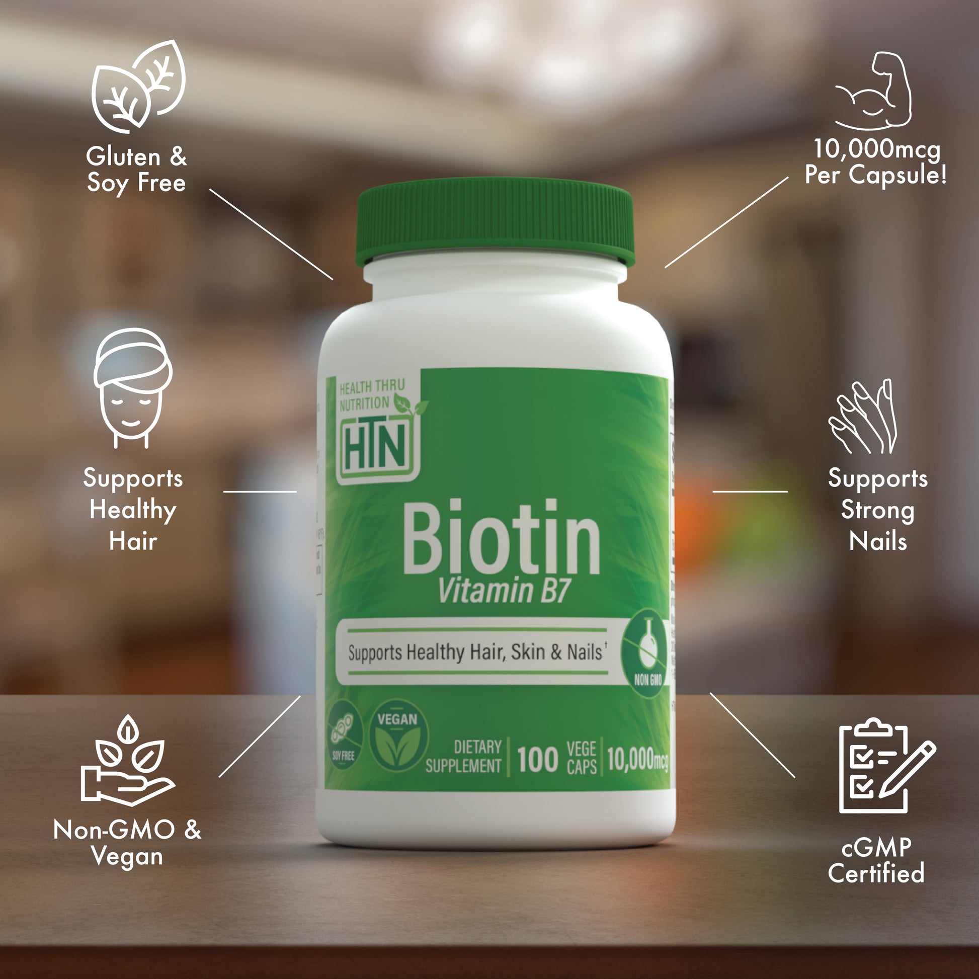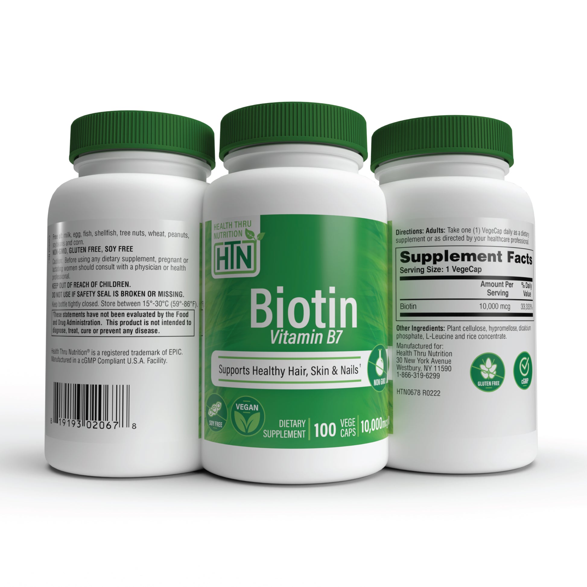 Health Thru Nutrition’s Vegan Biotin Vitamin B7 supplement provides a high-potency 10,000 mcg dose of this essential nutrient per serving. Biotin is a water-soluble B vitamin involved in the body’s normal metabolism of carbohydrates, proteins, and fats. It is also recognized for its role in maintaining keratin production, which is important for hair, skin, and nails.