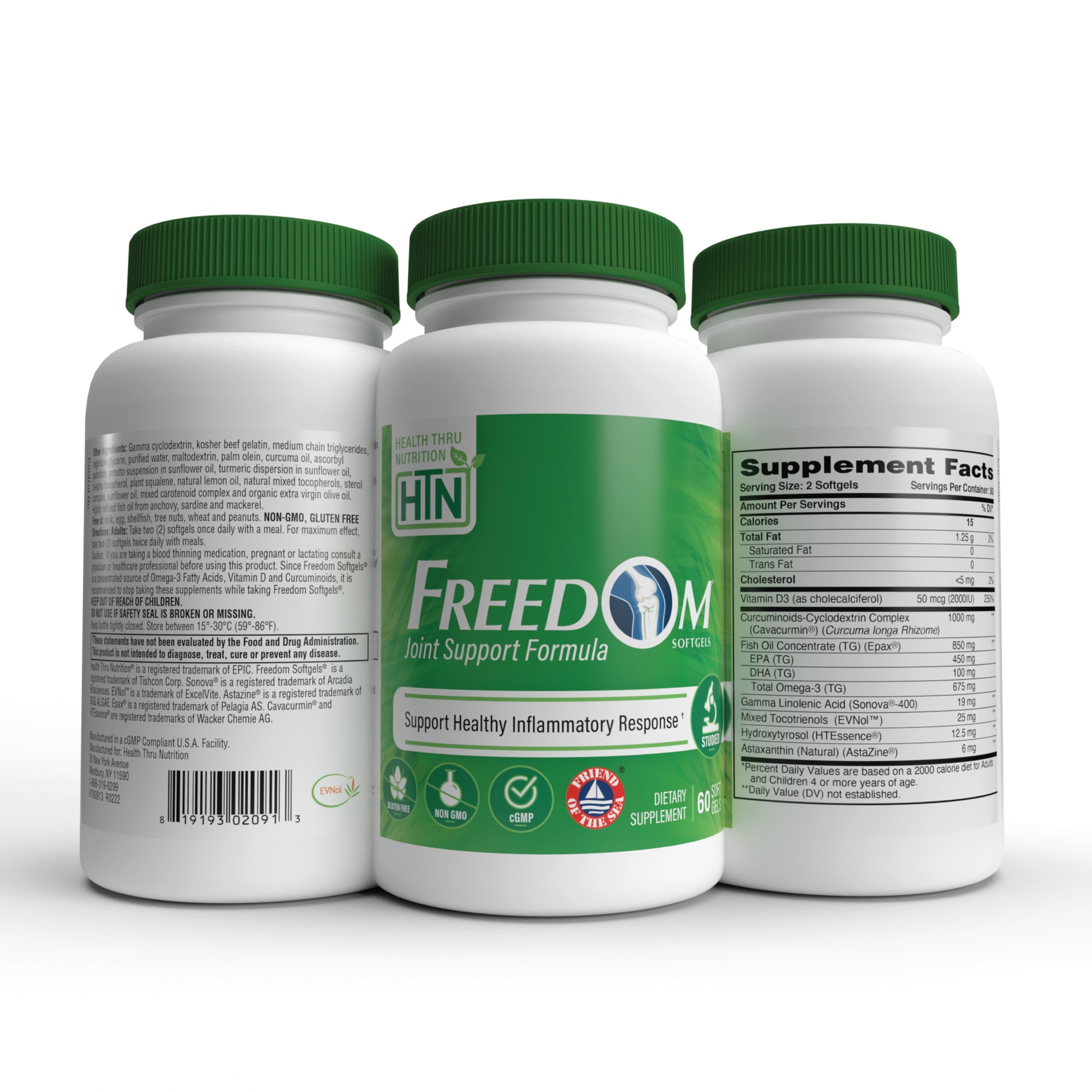 Freedom Softgels® is a unique supplement that combines high-absorption curcumin, wild-caught fish oil, gamma-linolenic acid, vitamin E, vitamin D, and hydroxytyrosol organic astaxanthin. This carefully crafted formula provides a blend of essential nutrients designed to complement a balanced wellness routine.