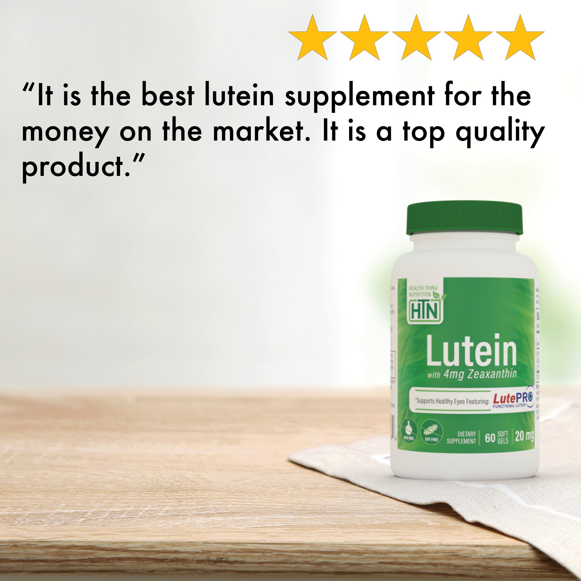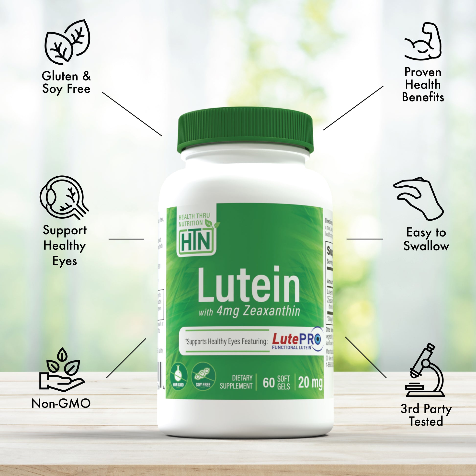 Health Thru Nutrition's Lutein formula is designed to support healthy vision with its powerful blend of Lutein and Zeaxanthin. These essential carotenoids are concentrated in the macula of the eye, where they may help protect against oxidative stress. LutePro® provides a potent dose of 20mg Lutein and 4mg Zeaxanthin per softgel in a nature-identical 5:1 ratio derived from marigold flowers. The trans-Lutein in LutePro® is the most bioavailable form, ensuring maximum absorption and effectiveness.